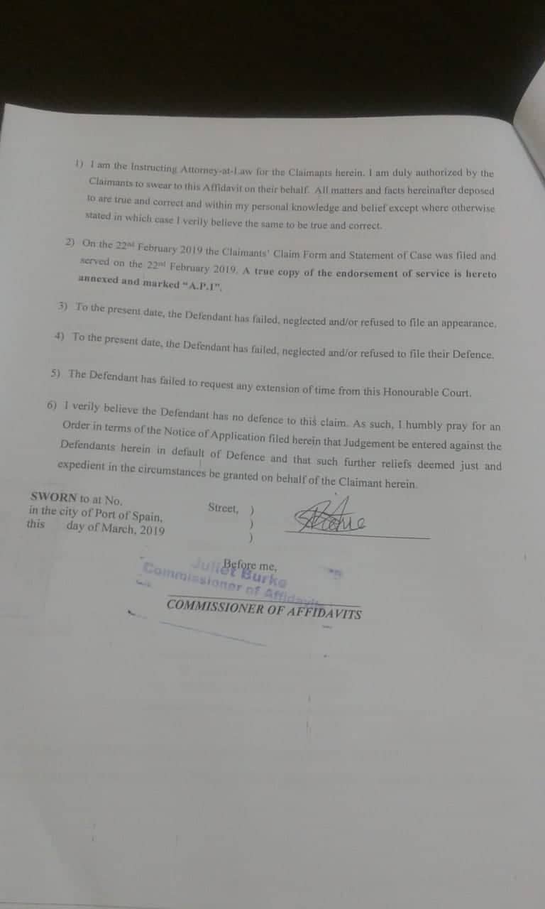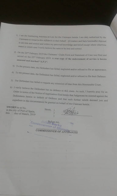 And, on May 17th, 2019, in Courtroom POS 20 @ 10 45 AM at the High Court of Justice in Port of Spain, the application for a default judgment will be heard before Madame Justice Margaret Mohammed.